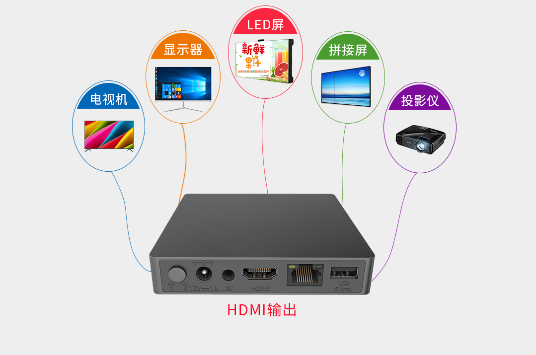 同步输出信号到电视、拼接墙、投影仪等显示设备, 支持1920*1080高清输出。 |